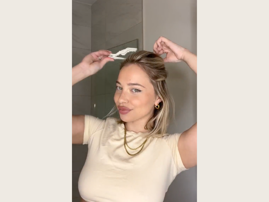Clip in the extensions. Attach the clip-ins by securing the pressure-sensitive clips into your hair.
